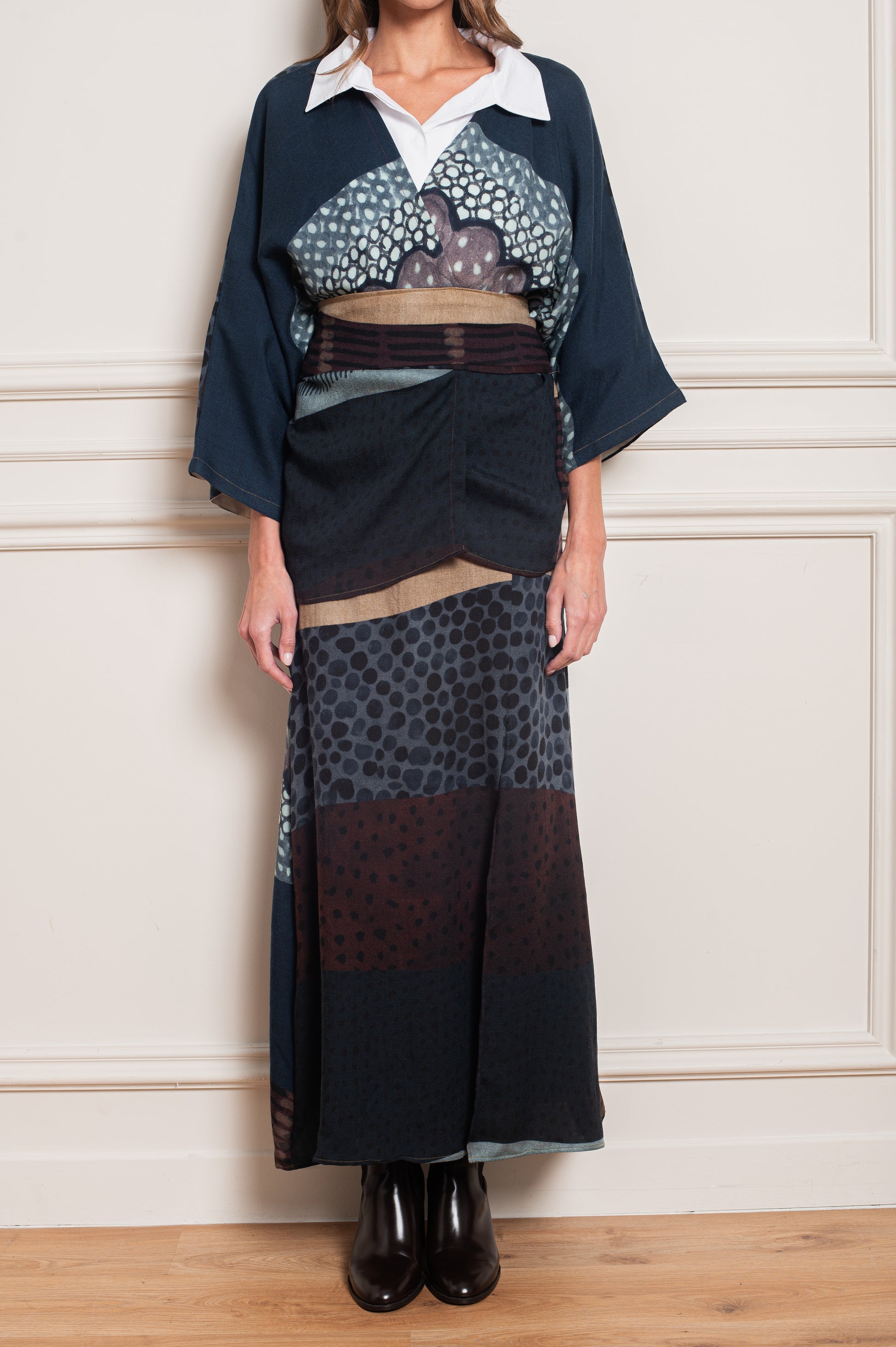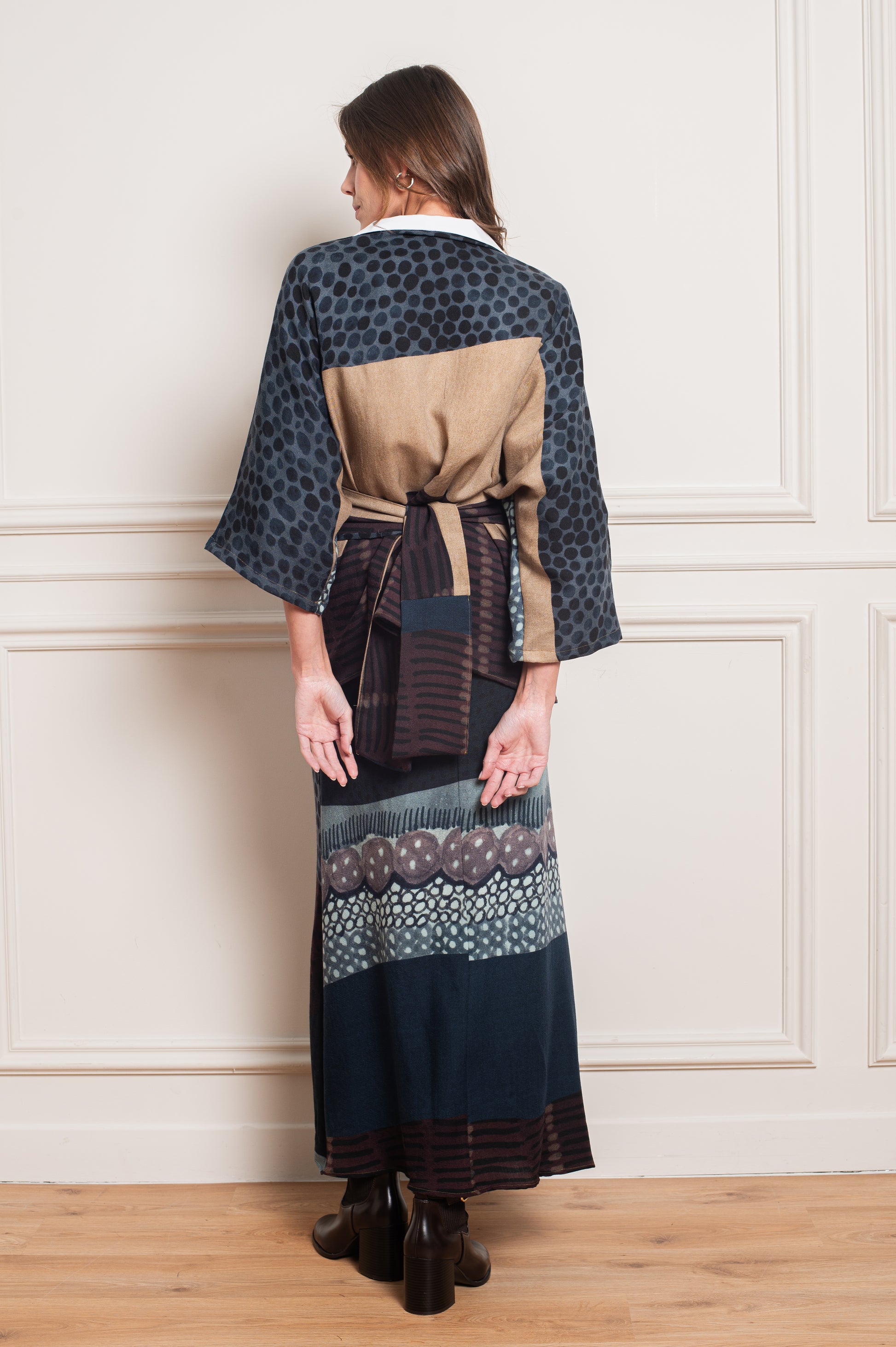 Kimono shirt with belt. Elegantly tailored from ultra-light 100% pure Italian wool, this kimono-style shirt fuses soft structure with bold, graphic expression—ideal for spring layering. Its asymmetric motifs and deep, earthy tones bring a modern edge to timeless artisanal craftsmanship.